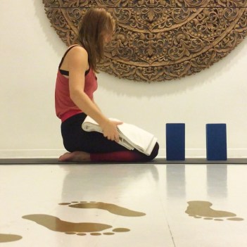 4. Deep backbend with two blocks (highest level) and virasana legs (or choose other leg variation). Hold the sides of the mat but just hold, don’t push or draw. You should warm up the hip flexors before doing this leg variation as well. Once in the pose, lift up the butt and release the sit bones forward.