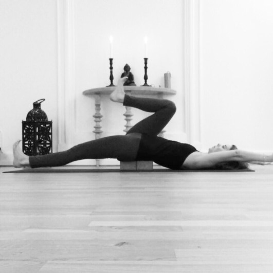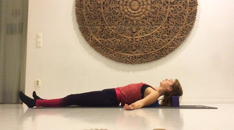 2. Restorative backbend with two low blocks under the shoulder blades. They go all the way up to the end of shoulder and one block under head (one level higher)